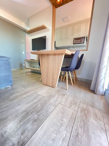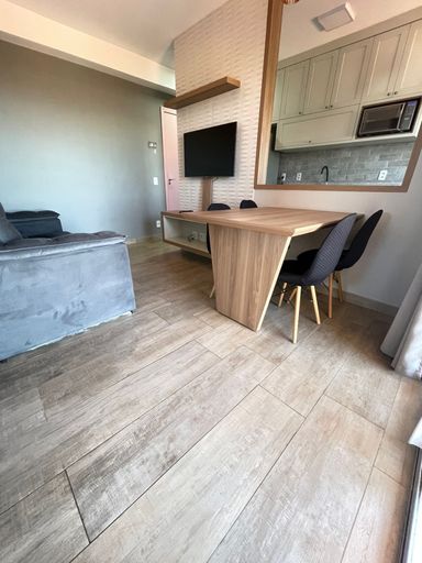 A sala de estar já conta com painel e TV, e a sala de jantar vem com uma mesa linda, pronta pra receber amigos e família 🍷✨.